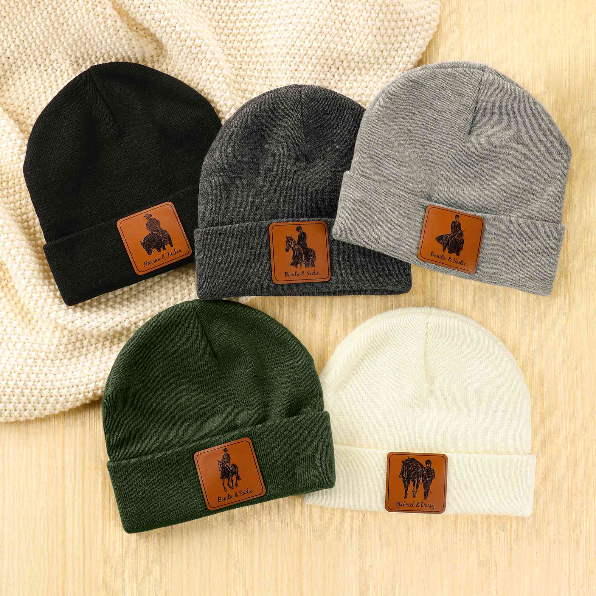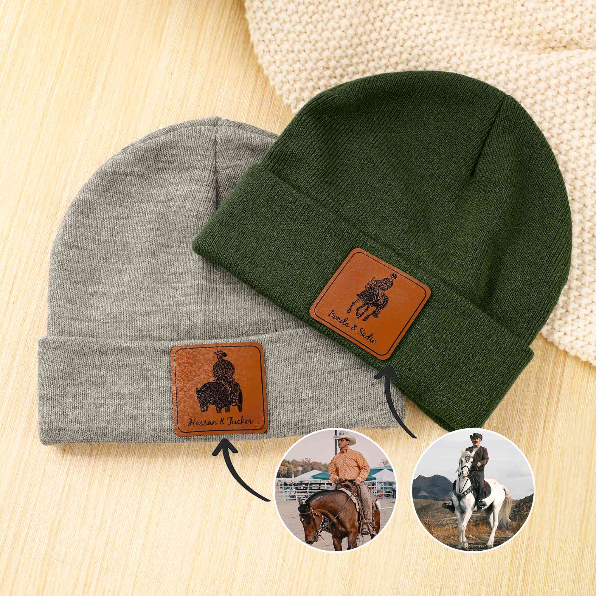 Personalized Horse Photo Leather Patch Beanie with Name, Horse Portrait Knit Beanie Hat, Birthday/Christmas Gift for Horse Lovers/Riders/Equestrians